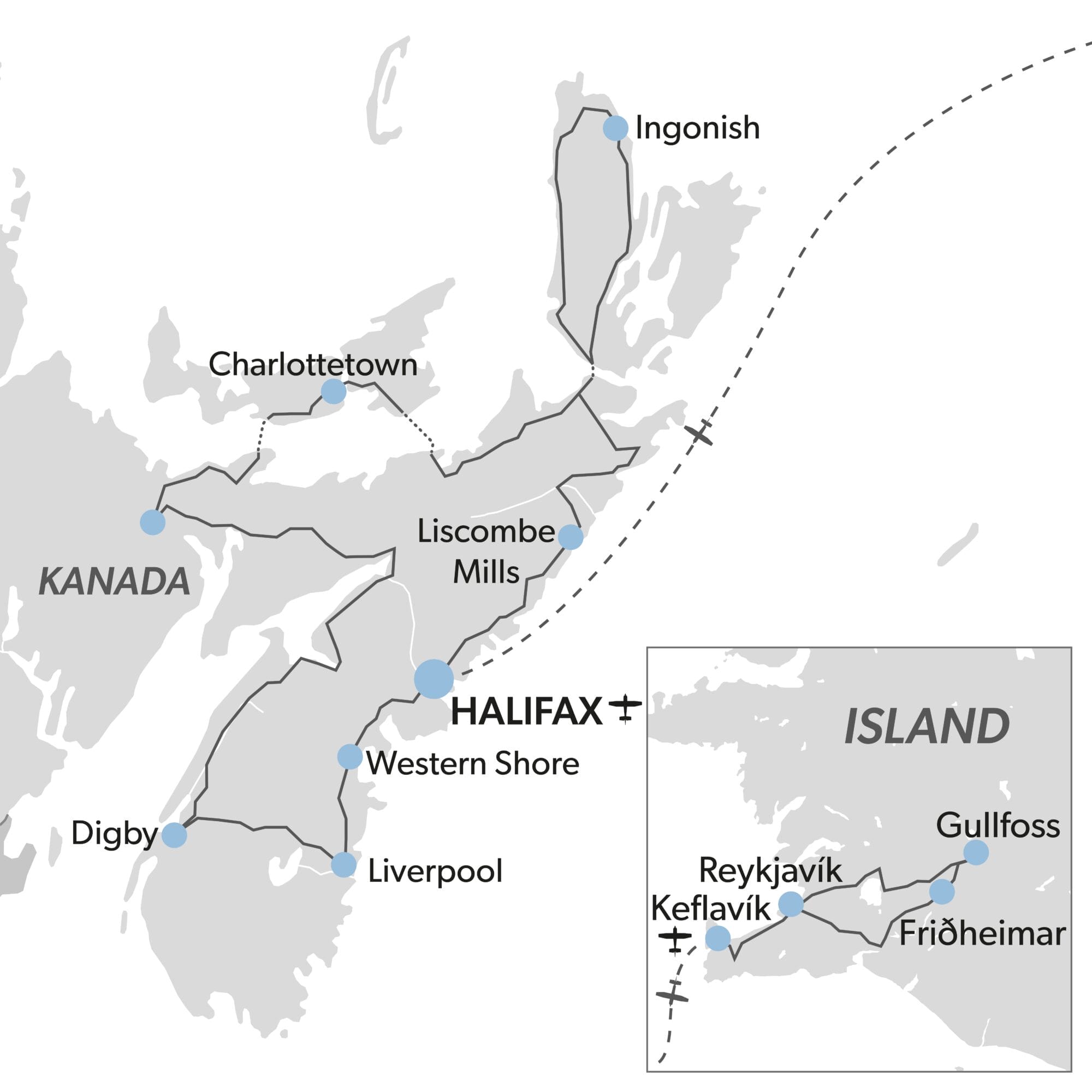 Eine circa 4-stündige Flugstrecke bringt Sie von Europa direkt auf die faszinierende Vulkaninsel Island. Bei einem Stopover-Programm erhalten Sie außergewöhnliche Einblicke in die Vielfalt dieses einzigartigen Reiseziels. Entspannen Sie in thermalwarmen Pools, bestaunen Sie beeindruckende Geysire oder entdecken Sie die Hauptstadt Reykjavik. Island hat eine Menge zu bieten! Weiter geht es nach nach Kanada! Sie starten Ihre Selbstfahrer-Rundreise in Halifax, der Hauptstadt von Nova Scotia, und besuchen verträumte Fischerdörfer. Durchqueren Sie weitläufige Seen- und Waldlandschaften, erleben Sie den größten Tidenhub der Welt in der Bay of Fundy und genießen Sie außerdem die Möglichkeit, die kleinste Provinz Kanadas, „Prince Edward Island“, zu entdecken. Auf Cape Breton können Sie herrlich wandern oder an einer Walbeobachtungstour teilnehmen. Lassen Sie sich nicht entgehen, die älteste Festung in Louisbourg zu besichtigen, bevor Sie der spektakuläre „Marine Drive“ zurück nach Halifax führt. Nach der Rückgabe Ihres Mietwagens am Flughafen treten Sie schweren Herzens die Heimreise an.