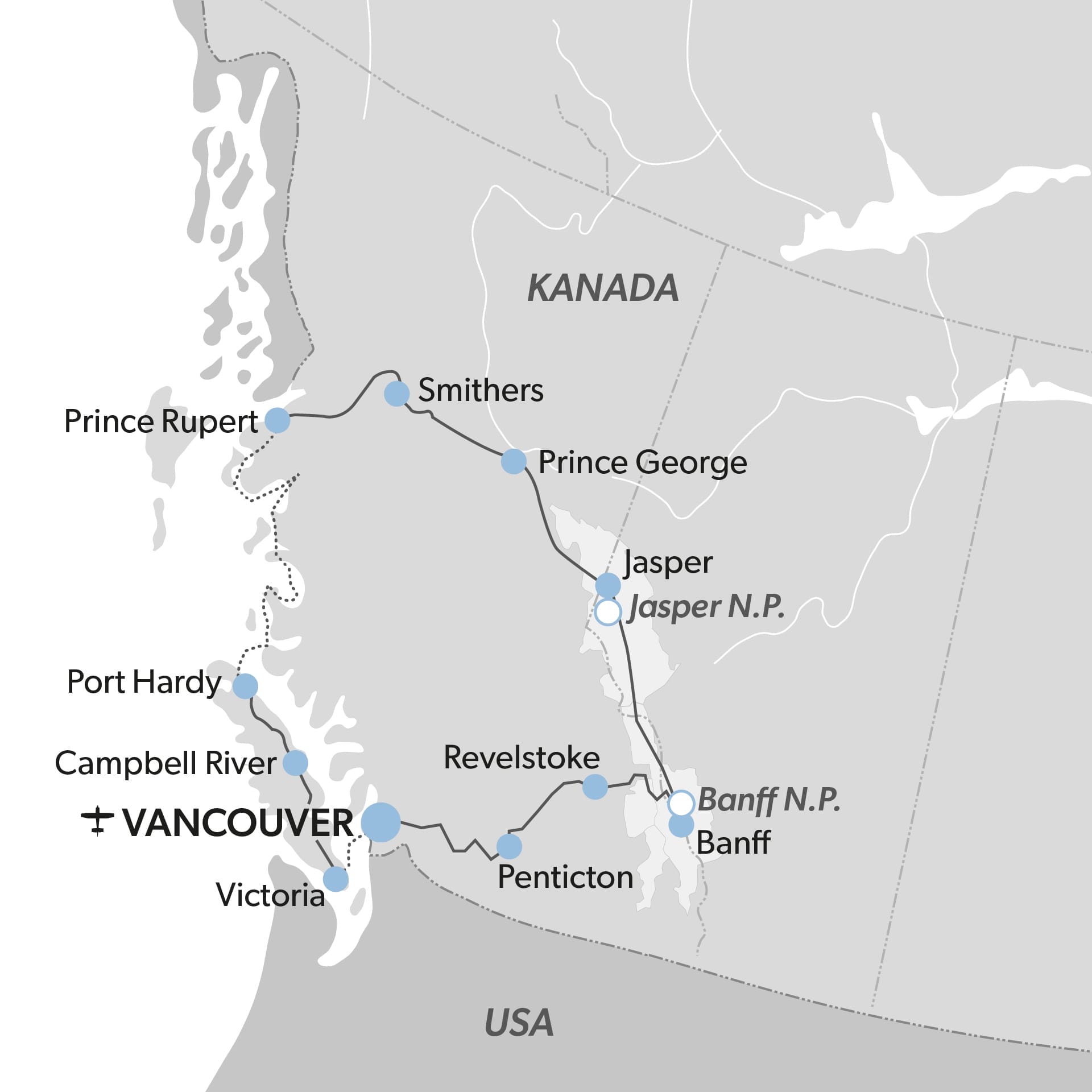 Kanadas Westen entdecken – eine klassische Mietwagenrundreise durch British Columbia und Alberta Erleben Sie eine der schönsten Routen Kanadas mit beeindruckenden Landschaften, spektakulären Nationalparks und lebendigen Städten. Von Vancouver aus reisen Sie durch das sonnenverwöhnte Okanagan Valley und den majestätischen Glacier-Nationalpark bis in die weltberühmten Urlaubsregionen Banff und Jasper in den kanadischen Rocky Mountains. Über den imposanten Mount Robson, den unberührten Wells Gray Provincial Park und die historische Cariboo-Region führt Sie die Reise weiter in den Norden zur Pazifikküste. Dort erwartet Sie eine unvergessliche Fahrt mit der BC Ferries entlang der Inside Passage nach Vancouver Island. Genießen Sie die charmante Provinzhauptstadt Victoria, bevor es per Fähre zurück nach Vancouver geht.
