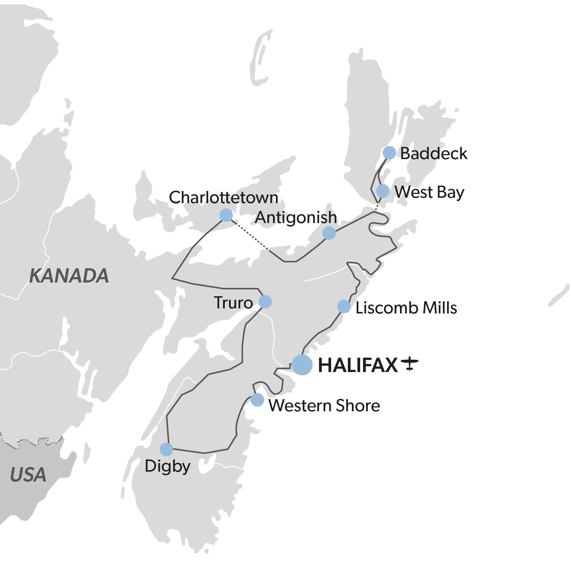 Sie starten Ihre Selbstfahrer-Rundreise in Halifax, der Hauptstadt von Nova Scotia, und besuchen verträumte Fischerdörfer. Sie durchqueren weitläufige Seen- und Waldlandschaften, erleben den größten Tidenhub der Welt in der Bay of Fundy und haben außerdem die Möglichkeit, die kleinste Provinz Kanadas, „Prince Edward Island“, zu entdecken. Auf Cape Breton können Sie herrlich wandern oder an einer Walbeobachtungstour teilnehmen. Lassen Sie sich nicht entgehen, die älteste Festung in Louisbourg zu besichtigen, bevor Sie der spektakuläre „Marine Drive“ zurück nach Halifax führt. Nach der Rückgabe Ihres Mietwagens am Flughafen treten Sie schweren Herzens die Heimreise an.