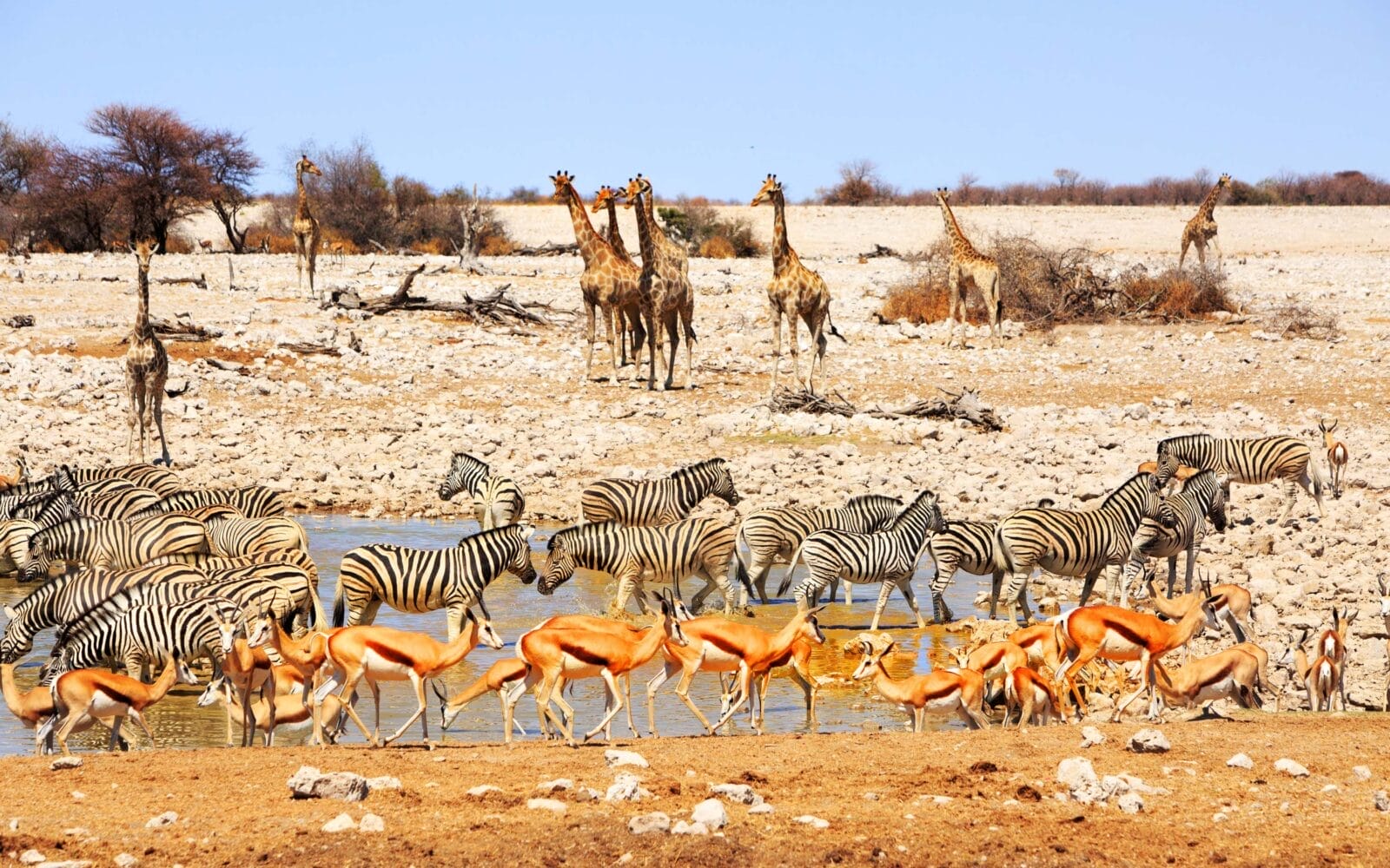 Der Etosha Nationalpark liegt im Norden Namibias und darf auf keiner Reiseroute fehlen. Auf über 22.000 Quadratkilometern findet man hier die höchste Konzentration an Wildtieren des Landes- beste Voraussetzungen für aufregende Pirschfahrten. Die Landschaft ist durch weite Steppen und Savannen gekennzeichnet, die eher spärlich bewachsen sind. Ein Highlight ist die gigantische Salzpfanne, die knapp ein Viertel des Nationalparks einnimmt und sogar vom Weltraum aus sichtbar ist. Die höchste Chance auf spektakuläre Tiersichtungen hat man in der Trockenzeit, wenn sich die Tiere an den Wasserlöchern versammeln.