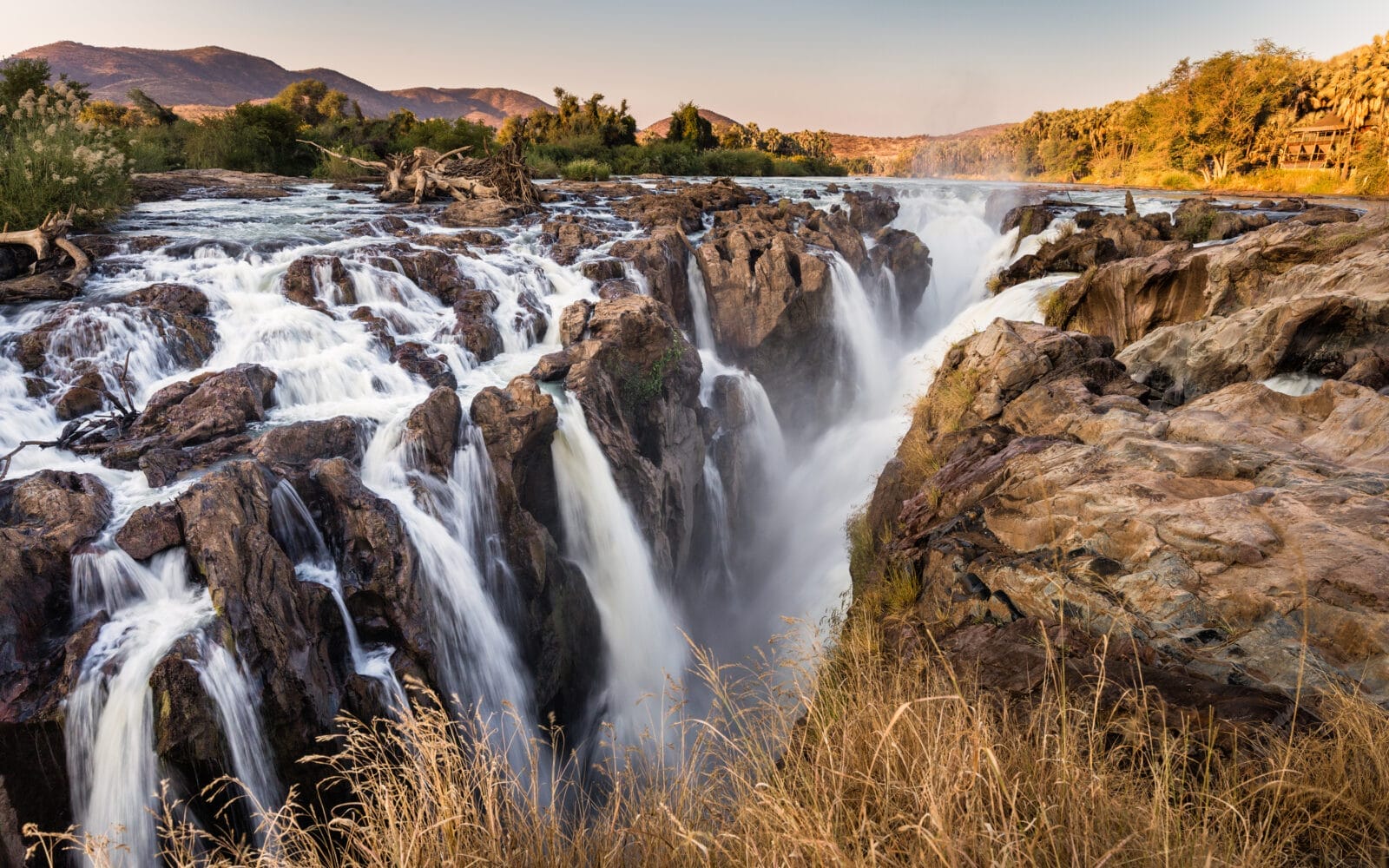 Hoch im Norden Namibias bildet der Kunene- River eine natürliche Grenze zu Angola. Der Fluss ist einer der fünf Flüsse Namibias der ganzjährig Wasser führt. Er stellt somit eine wichtige Lebensader für Mensch und Tier dar. Der schmale, aber üppige Vegetationsstreifen bildet Heimat für eine vielfältige Vogelwelt, Affen sowie Krokodile. Baden im Fluss sollte daher vermieden werden. Epupa entstammt der Sprache des Volks Herero und bedeutet so viel wie “fallendes Wasser”. Eine passende Bezeichnung für die schönen Wasserfälle, die sich 40 Meter in die Schlucht stürzen, die Ende der Regenzeit in den Monaten April- Mai besonders eindrucksvoll sind.