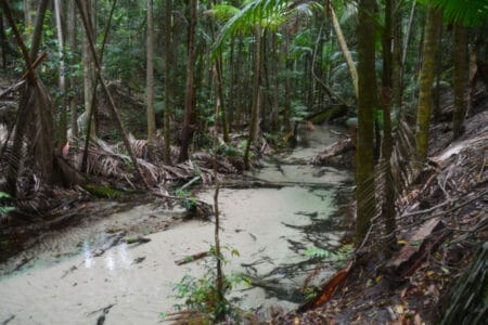 Vom See aus starteten wir unsere ca. 5 km lange Wanderung durch das Pine Valley von Fraser. Trotz Sand wächst hier, wie bereits erwähnt, ein waschechter Regenwald, durch den unser Weg führte. Riesige, alte Bäume säumten den Weg. Nach einiger Zeit erreichten wir dann den Wanggoolba Creek. Erst beim zweiten Hinsehen konnte man das langsam fließende Wasser sehen. Erneut war es so klar, dass es mit dem bloßen Auge vor dem weißen Sand kaum zu erkennen war. Wir folgten dem Creek auf unserer Wanderung und erreichten schließlich Megan und unseren wartenden Bus am Ende des Weges.