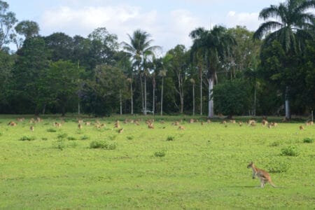 Da das sich das Wetter auch heute wieder von seiner besten Seite präsentierte (wer war nochmal dieser Owen?), haben wir noch einen Strand-Nachmittag am Ellis Beach eingebaut. Generell sind die Strände hier rund um Palm Cove ein echter Traum. Diese sind mit Netzen gegen Quallen versehen, sodass man während der Quallensaison von November bis Mai die Möglichkeit hat, dort in den Pazifik zu hüpfen.  Apropos hüpfen: Auf unserem Heimweg sind wir noch ein paar Kängurus über den Weg gelaufen 😉