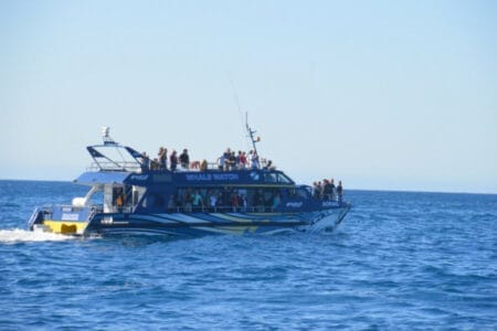 Nach der kurzen Einweisung wurden wir dann mit einem Shuttlebus zur Anlegestelle in der South Bay gebracht. Die nette Crew an Bord hatte dann auch keine Zeit zu verlieren, uns den Walen näher zu bringen. Schnell ging es mit hohem Tempo raus aufs offene Meer. Während die Crew Mitglieder und wir Passagiere an Bord mit bloßem Auge nach den riesigen Meeresbewohnern Ausschau hielten, wurde dabei natürlich auch modernste Technologie wie GPS und Echolot genutzt, um die Wale, die sich ganzjährig vor der Küste aufhalten, zu orten.