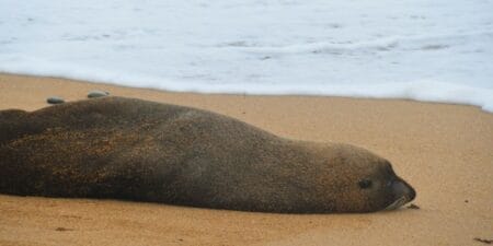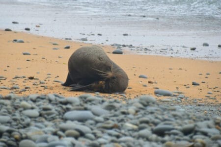 Von unserem Herbert Forest Campground steuerten wir zunächst das kleine Örtchen Oamaru an. Dort gibt es nicht nur einen tollen Aussichtspunkt, bei dem man einen super Blick über die Küste und die Stadt hat, sondern es ist auch das zu Hause der Gelbaugenpinguine. Als bekennende Langschläfer schafften wir es jedoch nicht, ein bis zwei Stunden nach Sonnenaufgang (wie in unserem Boomerang Reisen Tourenmanual eigentlich empfohlen war) dort zu sein. Wir bogen erst am späten Vormittag in die Bushy Beach Road ein. Dadurch, dass die Pinguine tagsüber auf Nahrungssuche in den Weiten des Ozeans unterwegs sind, stand unsere Chance die Meeresbewohner zu sehen gleich Null. In dem Wissen hatten wir natürlich keine großen Erwartungen die kleinen gefiederten Freunde anzutreffen. Ganz umsonst war der Besuch dort trotzdem nicht. Am Strand begegneten uns nämlich die coolsten Chiller der Ostküste, die wir auch einige Zeit beim Rekeln, Strecken und Schlafen beobachten konnten: