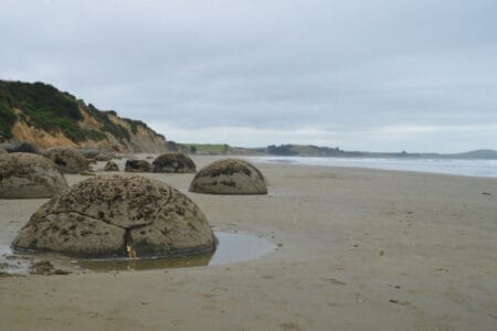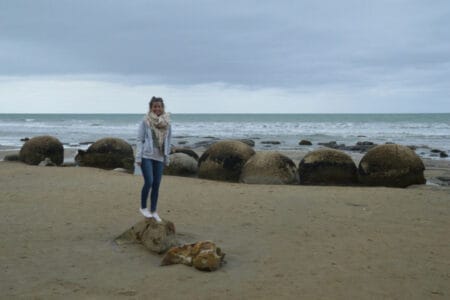 Marvin hat von dem Strandbesuch auch noch sein ganz eigenes Souvenir mitgebracht aber das kann er mal an anderer Stelle erzählen. Von Oamaru aus folgten wir anschließend der Küstenstraße. Diese verläuft abseits vom eigentlichen Highway bis zum nächsten kleineren Örtchen Moeraki. Trotz nach wie vor recht eisiger Temperaturen (zumindest hieß es Jacke und Schal für Anna, Marvin blieb seinen Flip-Flops weiterhin treu) lohnt sich der Besuch der dortigen Moeraki Boulders allemal. Die Boulders sind Steinkugeln, die sich vor Millionen von Jahren an der Küste gebildet haben. Seither liegen sie wild verteilt entlang des Strandes. Heute sind sie ein berühmter Touristenmagnet, was nicht nur die vielen Busparkplätze am Besucherparkplatz zeigten. Allein’ wird man sie also wohl nie bestaunen können. Dennoch lohnt sich der Stopp, gerade wenn man auf dem Weg Richtung Süden ist.