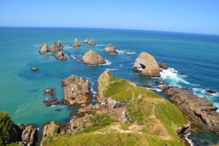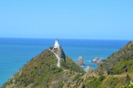 Der nächste Tag begann zwar immer noch recht frisch, allerdings setzten wir unsere Küstentour bei strahlend blauem Himmel und Sonnenschein fort. Unser erstes Etappenziel war der Nugget Point. Auf dem Weg dorthin legten wir jedoch erst noch eine schöne Essenspause am Kaka Point ein (Ihr dürft grinsen, wir fanden es auch witzig). Die kleine Siedlung liegt kurz vor dem berühmten Nugget Point und ist der ideale Platz für ein kleines Päuschen. Dank unserem Apollo haben wir immer alles dabei was das Herz begehrt und so ließen wir es uns dort erst mal bei traumhaftem Ausblick richtig gut gehen.