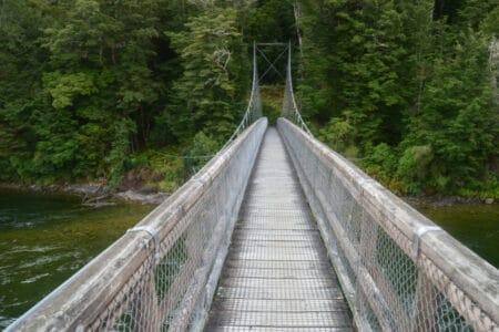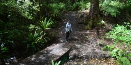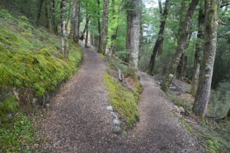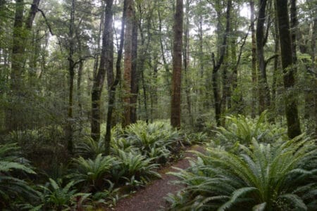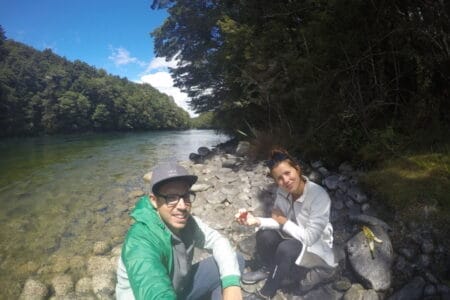 Der gesamte Wanderweg umfasst dabei eigentlich 60 km und dauert so in seiner gesamten Schönheit über ca. 4 Tage. Da wir aber so viel Zeit nicht haben, begnügten wir uns mit der etwa 4-stündigen Wanderung von Te Anau bis zum Rainbow Reach Punkt. Diese tolle Etappe des Tracks führt dabei durch mystisch anmutende Waldgebiete entlang des Waiau Rivers. Hier fanden wir auf halber Strecke auch ein tolles Fleckchen am Ufer des Flusses. Der perfekte Platz, um ganz ungestört unsere Mittagspause bei bestem Ausblick zu genießen. Die Wanderung führte uns abwechselnd durch Graslandschaften und Wald. Dabei konnten wir immer wieder den Blick auf die alpinen Berge und die tropischen Farne inmitten der Nadelbäume genießen. Schließlich erreichten wir unseren Endpunkt der Wanderung: Die Hängebrücke über dem Waiau River.