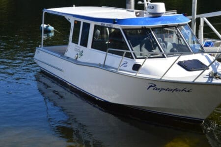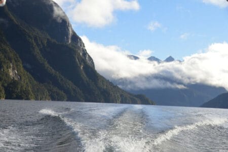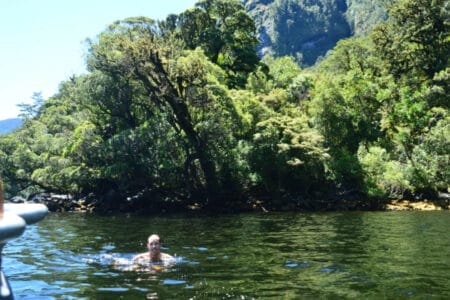 Als die Tour dann zu Ende war, bot sich nochmal die Möglichkeit, ins kühle Wasser des Fjords zu springen. Dadurch, dass wir uns am Morgen vielleicht etwas zu dick angezogen hatten, war eine Abkühlung bitter nötig! Zumindest Marvin wagte den Sprung ins Wasser, war aber froh nach einer halben Minute wieder sicher auf dem warmen Boot zu sein. Die 15 km zurück durch den Fjord ging es dann per Boot, so hat man sogar noch seine ganz eigene Doubtful Sound Cruise zusätzlich mit inklusive und kann die schweren Kajak-Ärmchen etwas ausruhen. Anschließend steuerte Cloudy wieder sicher über den Wilmot Pass zurück zu Boot Nummer 1, mit dem wir letztendlich über den Lake Manapouri (der übrigens schönste See Neuseelands!) wieder zurück nach Manapouri fuhren.