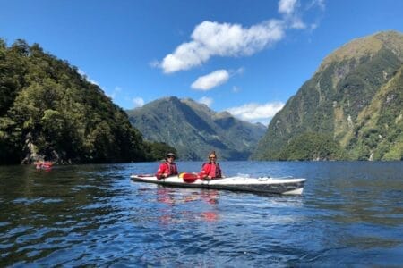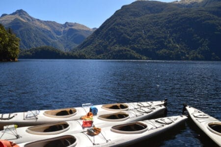 Und dann war es endlich so weit: Ab in die Zweier-Kajaks und raus auf das Wasser. Und was sollen wir sagen: Wir kamen aus dem Staunen nicht mehr heraus! Der Anblick, der sich schon vom Wilmot Pass offenbarte, war vom Wasser aus noch einmal viel intensiver und tatsächlich zum Greifen nah. So nah wie mit dem Kajak kommt man wohl selten an die zahlreichen Bäume, Pflanzen, Felsen und Wasserfälle. Wir hatten tatsächlich das Gefühl, diesen Fjord als allererste zu entdecken. Außer zwei Booten und ein paar anderen Kajaks sahen wir den ganzen Tag niemand anderen – und wir waren schließlich ganze 4 Stunden auf dem Wasser unterwegs.