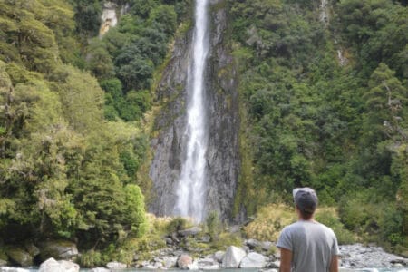 Unser Boomerang Reisen Tourenmanual machte uns vorab auch noch darauf aufmerksam, uns die Broschüre „Walks along the Haast Highway“ genauer anzuschauen. Dort sind ähnlich wie wir es bei der Milford Road hatten, einzelne kleinere Stopps inklusive Wanderungen beschrieben, sodass man die Route gut planen kann. Trotz der bereits vorangeschrittenen Zeit legten wir somit auch noch zwei kürzere Stopps bei Wasserfällen ein und besuchten die Thunder Creek Falls sowie die Fantail Falls. Den im Tourenmanual sehr schön beschriebenen Blue Pools Walking Track mussten wir leider wegen Zeitmangel auslassen. Die Wasserfälle haben sich aber definitiv gelohnt! Kurz vor Einbruch der Dunkelheit erreichten wir dann schließlich den kleinen Ort Fox mit dem gleichnamigen Gletscher.