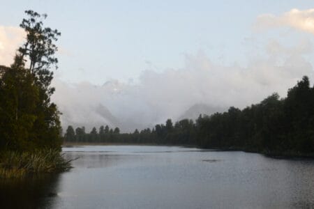 Am Mittag fuhren wir zum Aussichtspunkt des Gletschers etwas außerhalb des Ortes. Dort haben wir auf dem dortigen Parkplatz unsere Mittagspause genossen und zumindest etwas Bewegung bei der anschließenden kurzen Wanderung gehabt. Der Ausblick beschränkte sich allerdings auf Wolken und den Fox River. Gegen Abend klarte es dann überraschend doch noch ein wenig auf. Und so führen wir zum nahegelegenen Lake Matheson und unternahmen dort noch einen abendlichen 5 km Spaziergang rund um den See ?. Wirklich schön und wer Zeit hat, sollte unbedingt einen kurzen Abstecher dort einlegen.