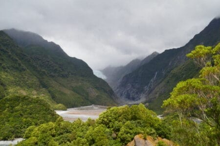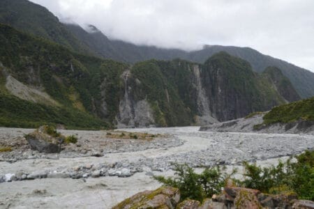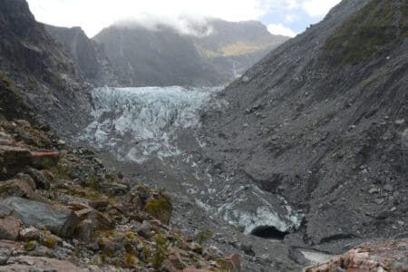 Freundlicherweise zeigte sich das Team von Fox Glacier Guiding aber sehr flexibel und hilfsbereit und bot uns alternativ den „Fox Trail: Terminal Face Walk“ an. Immerhin bekamen wir so die Chance, den Gletscher zu Gesicht zu bekommen und dabei noch etwas über die Umgebung zu lernen. Apropos Umgebung: Das faszinierende am Fox (und auch am Franz Josef) Gletscher ist, dass hier Regenwald direkt auf die alpinen Eisflächen trifft – und das nur wenige Kilometer vom Meer entfernt. Weltweit gibt es nur drei solcher Gletscher und wir hatten das Glück zwei davon zu sehen! Ein absolut bizarrer Mix, den man unbedingt erlebt haben muss, solange es noch möglich ist. Leider geht das Eis aufgrund des Klimawandels immer weiter zurück, sodass es heute bereits komplett anders aussieht als noch vor zehn Jahren.