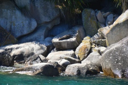 Wir wählten die früheste Variante am Morgen mit Start um 09:00 Uhr. Somit sollten wir genügend Zeit für unseren Walk haben. Das Boot war bei der Fahrt erfreulicherweise nicht nur ein reines Wassertaxi zur Personenbeförderung. Es steuerte unterwegs immer wieder Sehenswürdigkeiten entlang der Küste an wie den berühmten Split Apple Rock oder vorgelagerte Inseln mit Seehundkolonien und Zwergpinguinen. Für einen kurzen Halt samt Infos war immer Zeit und das machte die Fahrt zu einer kleinen Scenic Cruise. Zudem hatten wir den wohl witzigsten Skipper an Bord, den wir bisher als Guide auf unserer Reise erlebt haben. Bühne statt Boot wäre wohl hier angebracht, ein weiteres Beweisstück für den tollen Humor der Kiwis.