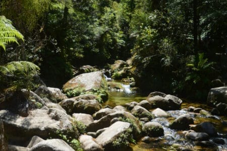 Der Coastal Walk ist teils sehr stark von den Gezeiten abhängig. Wie uns unser Skipper erklärte, kam es daher sogar schon vor, dass Wanderer, die den gesamten Track absolviert haben, auch mal um 04:00 Uhr nachts in ihre Wanderschuhe schlüpfen mussten, um Strandabschnitte überqueren zu können. Auch bei uns war die Flut gerade im vollen Gange, sodass wir die Torrent Bay nicht über die Strandpassage queren konnten. Wir mussten aber nicht ausharren, bis sich eine nächtliche Chance auftat, sondern konnten eine hier existierende Alternativroute durch den Regenwald nehmen. Diese ist sogar der deutliche schönere Part, als die Abkürzung durch das Wasser. Dadurch führte der Weg ebenfalls an dem schönen Cleopatra’s Pool vorbei. Der Fluss mit kleinem Wasserfall und natürlichem Pool war über einen kleinen Seitenweg leicht zu erreichen und lohnt sich als Abstecher allemal.