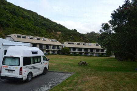 Zunächst aber galt es unseren Apollo sicher auf einem Campingplatz zu parken. Genächtigt haben wir während unseres Aufenthaltes in der Hauptstadt auf dem Capital Gateway Motor Inn Campground. Wie der Name schon vermuten lässt, kann man hier außer im eigenen Wohnmobil auch in den netten Zimmern des Motels übernachten. Da wir uns in unserem Apollo aber so richtig wohl fühlen, haben wir den kleinen Campground hinter dem Motel bevorzugt. Der Platz liegt dabei ca. 10 Fahrminuten von Downtown Wellington entfernt und bietet damit eine perfekte, nahe Anbindung in die Stadt. Ein großer Vorteil des Platzes ist auch, dass auf der gegenüberliegenden Straßenseite alle paar Minuten ein Bus in Richtung Stadt (und natürlich wieder zurück) abfährt; und das für günstige 5 $ pro Person und pro Fahrt.