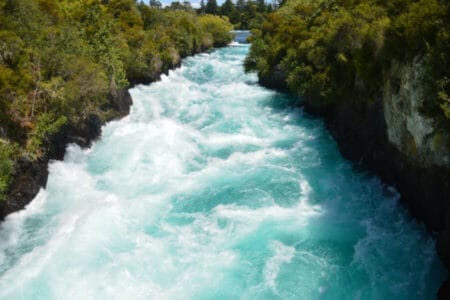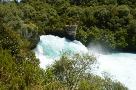 Zuvor wollten wir uns aber auch ein bisschen Sightseeing in der Gegend rund um Taupo nicht nehmen lassen. Wir besuchten daher die nahegelegenen Craters of the Moon, die einen nochmal die Vulkanlandschaft bildlich veranschaulichten. Aus jedem erdenklichen Erdloch pfiff heißer Dampf – ein surrealer Anblick. Die 8$ für den gut einstündigen Rundweg haben sich auf jeden Fall gelohnt. Quasi auf der anderen Straßenseite befinden sich noch die Huka Falls. Der Name ist etwas irreführend, da es sich nicht um einen klassischen Wasserfall handelt. Vielmehr fließt hier der Waikato River sehr schnell durch eine Verengung von einem Becken ins nächste und am Ende schießen dabei 200.000 Liter pro Sekunde in die unterste Flussebene.