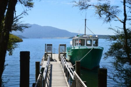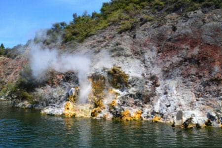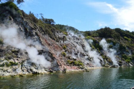 Die zwei Stunden vergingen dabei wie im Flug. Schon bald erreichten wir den Endpunkt unseres Fußmarsches, Lake Rotomahana. Dort erwartete uns bereits ein Ausflugsboot, mit dem wir 45 Minuten lang über den See schipperte. Der Skipper versorgte uns mit einer zweiten Broschüre, die allerhand Infos für uns bereithielt. Der See bestand bis 1886 aus zwei einzelnen kleineren Seen. Diese verschmolzen nach einem gewaltigen Ausbruch des hiesigen Vulkans zu einem großen See. Im Hintergrund thront der Mount Tarawera als Mahnmal dieser unvorstellbaren Naturgewalt. Wir fuhren durch einen mit Wasser vollgelaufenen Krater und entlang der rauchenden Felsen am Ufer des Sees. Bis zur Explosion gab es hier sogar noch eines der damaligen Weltwunder zu beobachten: die pinken und weißen Terrassen des Sees. Heute, lange nach der Explosion, sind leider nur noch Überbleibsel unterhalb der Wasseroberfläche davon übrig geblieben.