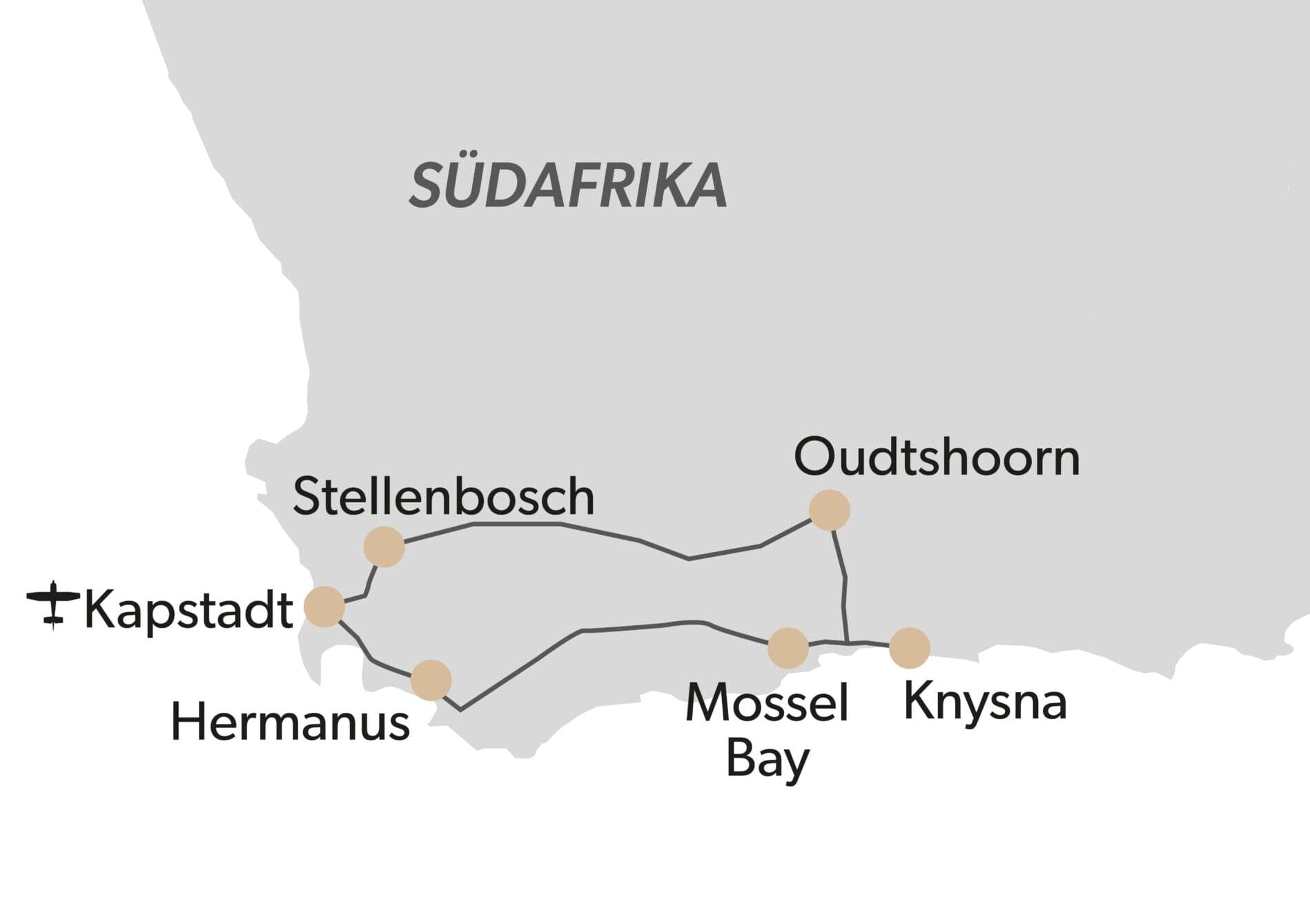 Südafrika begeistert mit einer der faszinierendsten Reiserouten der Welt – von der pulsierenden Metropole Kapstadt über die malerische Küste bis ins Herz der Halbwüste. Die Reise beginnt in Kapstadt, wo der Tafelberg majestätisch über der Stadt thront und das Kap der Guten Hoffnung zum Träumen einlädt. Entlang der Küste führt der Weg nach Hermanus, weltbekannt für seine Walbeobachtungen und charmanten Cafés mit Blick auf den Ozean. Weiter östlich lockt Mossel Bay mit goldenen Stränden und historischen Sehenswürdigkeiten, bevor die Route in das grüne Paradies von Knysna übergeht – ein Ort voller Lagunen, Wälder und kulinarischer Genüsse. Im Landesinneren erwartet Oudtshoorn mit seinen Straußenfarmen und den beeindruckenden Cango Caves ein ganz anderes Südafrika. Den krönenden Abschluss bilden die Winelands, wo sanfte Hügel, historische Weingüter und preisgekrönte Tropfen zum Verweilen einladen. Diese Reise verbindet Natur, Kultur und Genuss - ein unvergessliches Abenteuer durch die Westkap-Region.